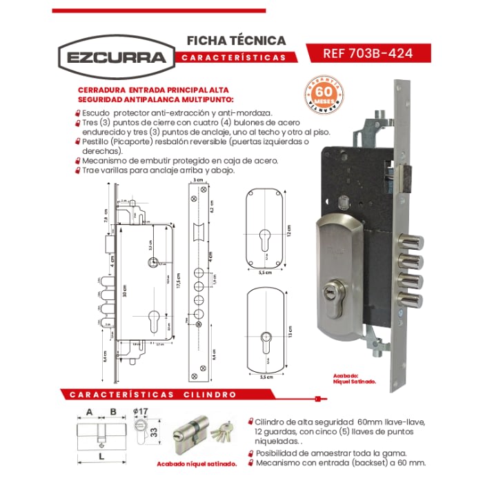 Cilindro de seguridad 60mm, 12 guardas y cinco llaves de puntos niqueladas.
