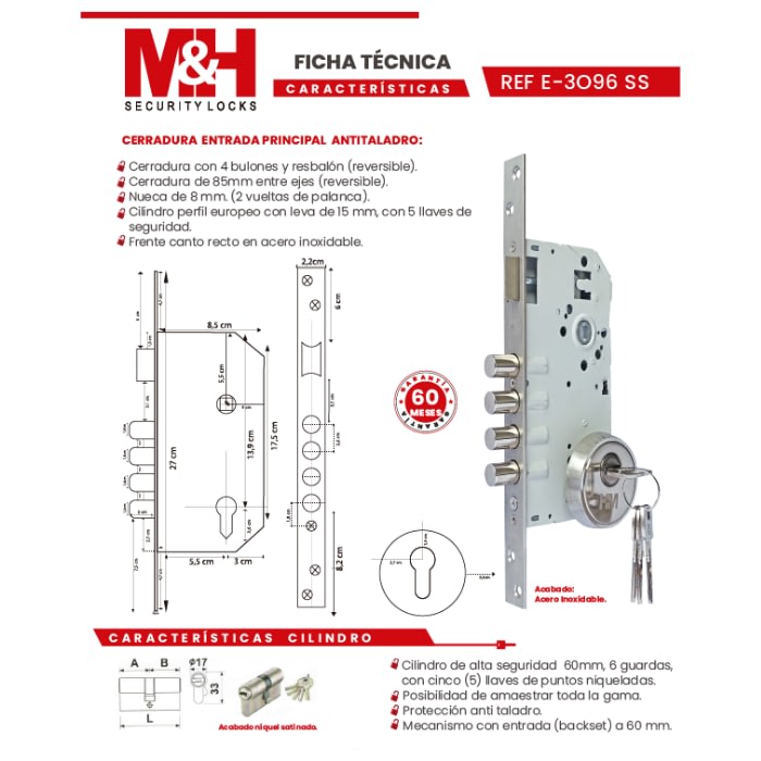 Mecanismo con entrada (Backset) a 60 mm, trae varillas para anclaje arriba y abajo.